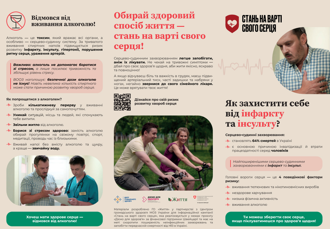 Матеріали розроблено ГО «Життя» у партнерстві з Центром громадського здоров?я МОЗ України для інформаційної кампанії «Стань на варті свого серця», яка реалізовується у рамках проєкту «Діємо для здоров’я» за фінансової підтримки Швейцарії та має на меті скорочення поширеності неінфекційних захворювань в Україні та запобігти передчасній смертності від НІЗ в Україні.