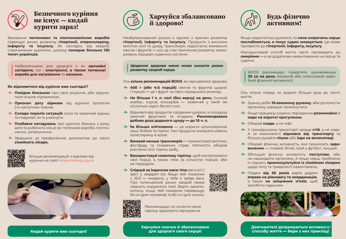 Здоровий спосіб життя допоможе вберегти твоє серце й судини від небезпечних хвороб та жити якісно й повноцінно! Пам?ятай про регулярні огляди у свого сімейного лікаря, аби вчасно помітити перші “дзвіночки” захворювання та отримати рекомендації щодо запобігання ССЗ.