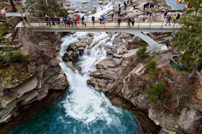 Водоспад Пробій – справжня візитівка Яремче й один із найвідоміших водоспадів Карпат. Його легко знайти, адже він розташований у самому серці міста, прямо на річці Прут. Потужні потоки води, що з гуркотом спадають із висоти понад 8 метрів, справляють незабутнє враження навіть на досвідчених мандрівників. Особливу атмосферу створює міст, перекинутий через річку поруч із водоспадом: з нього відкривається найкращий огляд на всю красу Пробою. Для дітей екскурсія сюди стає цікавою ще й завдяки сувенірному ринку неподалік, де можна придбати гуцульські талісмани, вироби ручної роботи та місцеві солодощі. Це місце ідеально підходить для шкільної поїздки, адже сюди легко дістатися, а сама прогулянка поєднує природу, культуру та яскраві враження.